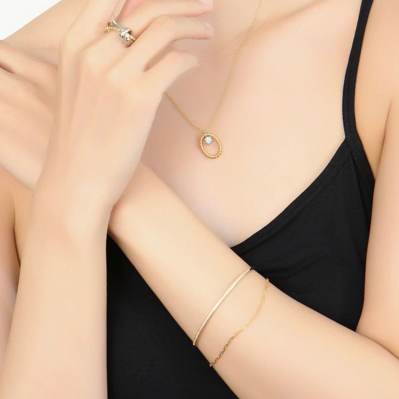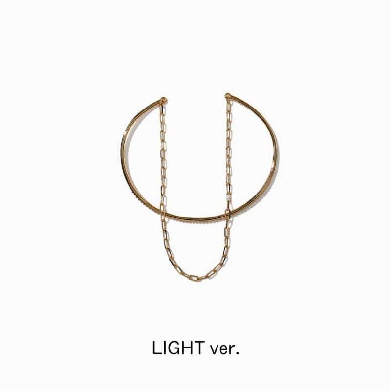 バングルには垂れるチェーンが付いており、スクエアチェーンを使用して抜け感をプラスしています。2つの月が重なり合うように2種類のラインが組み合わさり、単品でもレイヤードスタイルを叶える一品です。