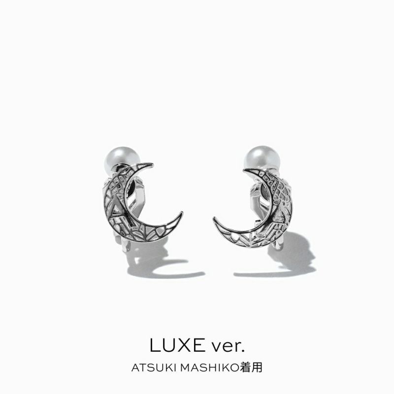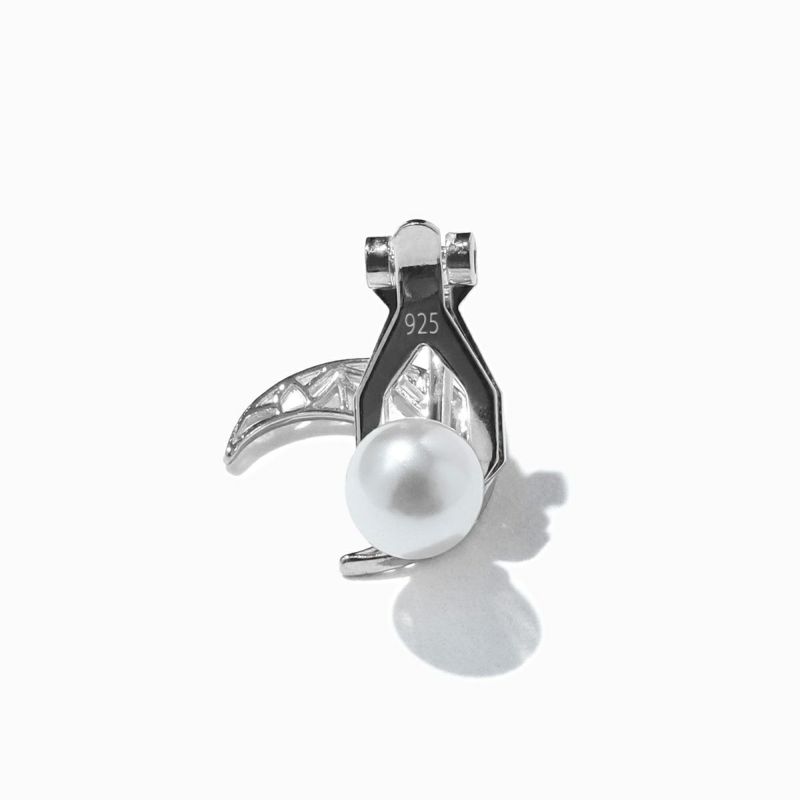 耳たぶの後ろには満月をイメージしたパールをセッティングし、前からも後ろからも異なる月が覗き込むユニークなデザインです。