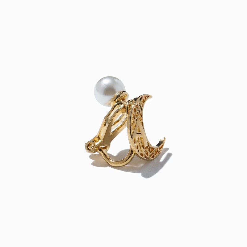 耳たぶの後ろには満月をイメージしたパールをセッティングし、前からも後ろからも異なる月が覗き込むユニークなデザインです。