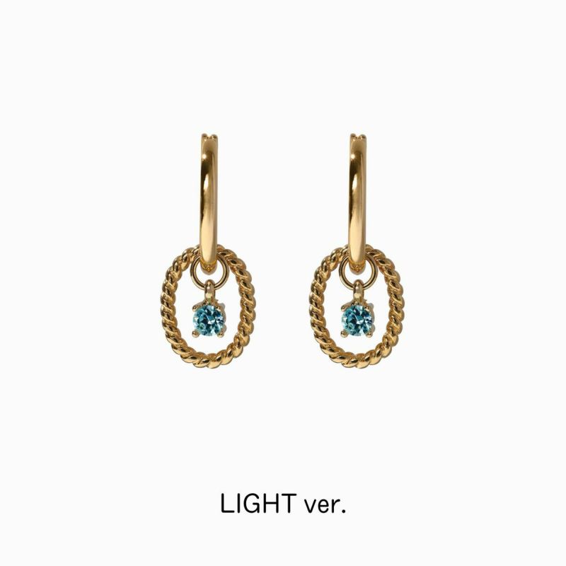 デザインフレームの中で浮かぶブルーのストーンは、惑星を思わせる神秘的で上品なデザインのピアスです。さりげない薄いブルーの輝きとフレームのツイスト、ストーンのサイズ感が絶妙なバランスで仕上がっています。