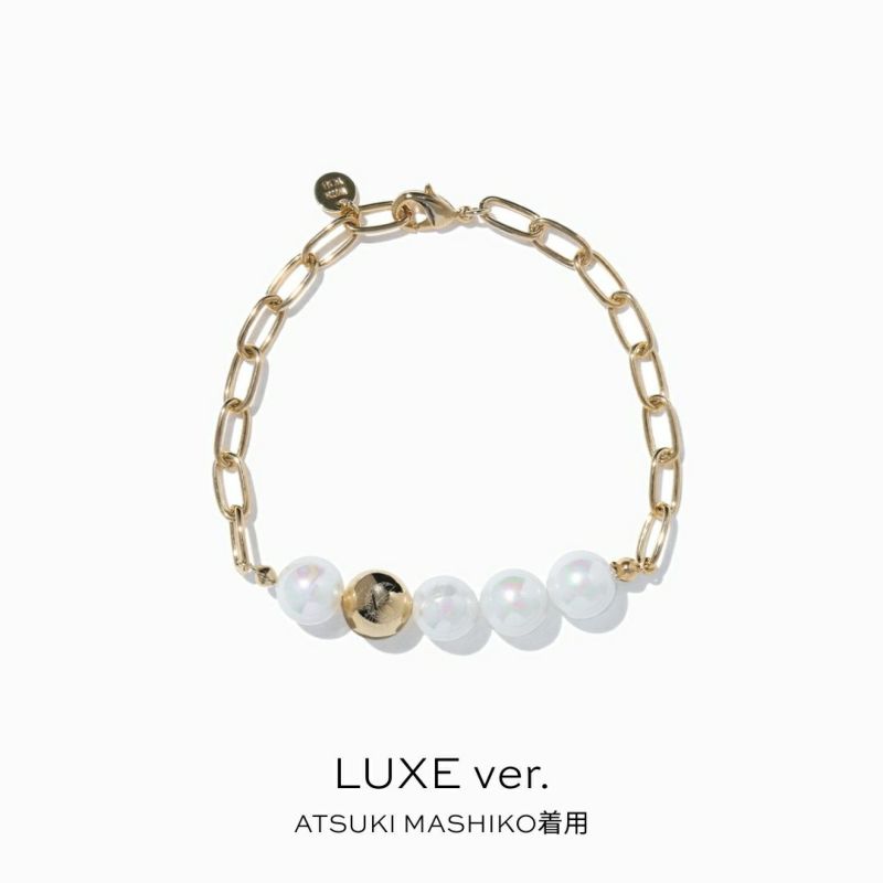 満月をイメージした大きめのシェルパールと、1st Anniversaryロゴを刻印したメタルボールがポイントのブレスレット。