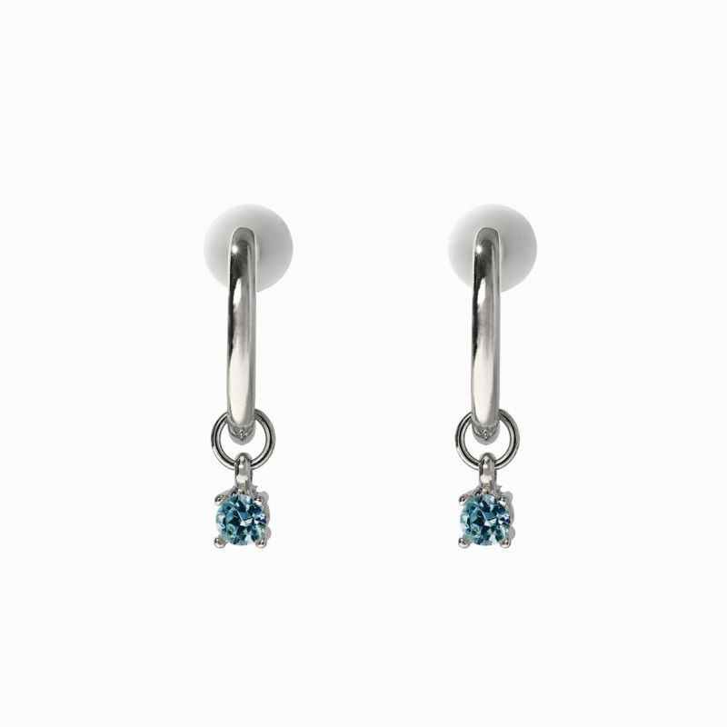 デザインフレームに浮かぶブルーのストーンは、惑星を思わせる神秘的で上品なデザインのイヤリングです。さりげない薄いブルーの輝きとフレームのツイスト、ストーンのサイズ感が絶妙なバランスを実現しています。